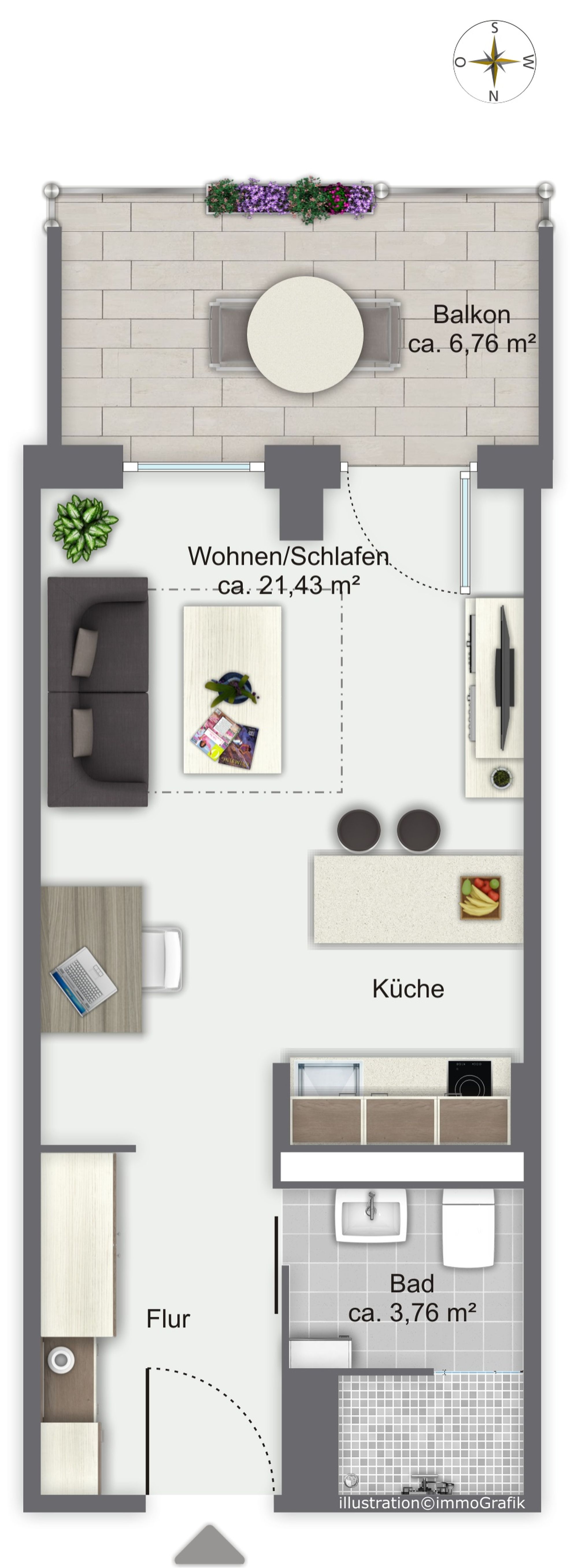 Die Wohnung verfügt über ein Wohn-/Schlafzimmer, eine hochwertige Küchenzeile inkl. Einbauküche, ein Badezimmer, eine Diele sowie einen großen Süd-Balkon. Das Apartment ist hochwertig möbliert mit Markenprodukten wie Domicil, Bang&Olufsen, Duravit und Hansgrohe.