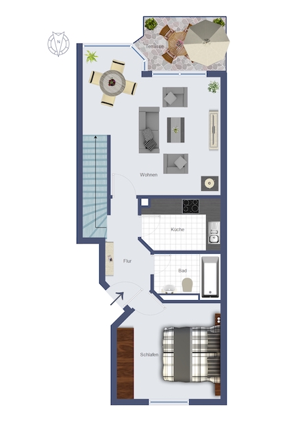 Neben einer Terrasse mit Südausrichtung verfügt die Wohnung über eine separate gemütliche Essnische mit Blick nach draußen – Diese grenzt an die Südterrasse an. Eine weitere Besonderheit der Wohnung stellt der Abgang in den ausgebauten und hellen Hobbyraum direkt vom Wohnzimmer aus dar. Das moderne und optisch ansprechende Bad verfügt über eine Duschkabine mit Glastüren, ein Waschbecken, ein WC, einen Badschrank mit Oberlicht sowie einen Handtuchheizkörper. Des Weiteren stellt der Vermieter eine Waschmaschine direkt im Bad zur Verfügung. Zur Wohnung gehört außerdem ein geräumiger Kellerraum, welcher direkt über den Hobbyraum erreichbar ist. Auch für die Fahrräder ist gesorgt: Hierfür existiert ein eigener Fahrradkeller zum sicheren Einstellen. Ein Personenaufzug ist natürlich auch vorhanden. Bei der Wohnflächenberechnung wurden die Terrasse und der Hobbyraum je mit der Hälfte der Fläche angesetzt.