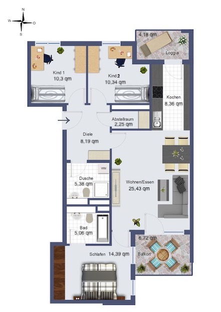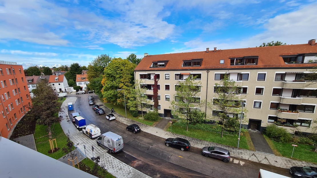 Die Wohnung befindet sich im 4. und obersten Stock eines gerade fertiggestellten Neubaus der Wohnanlage „Luisengrün“ in der Konrad-Celtis-Straße. Die helle und geräumige Wohnung verfügt über einen durchdachten Grundriss und eine hochwertige Ausstattung, zu der Fußbodenheizung, Eichenholzparkett, weiße Türen, eine Einbauküche und eine Kammer gehören. Über die geräumige Diele gelangen Sie in den Wohn-Ess-Bereich, den Mittelpunkt der Wohnung. Die Sichtachsen laufen von der an die Küche angrenzenden Loggia zur Südseite (Alpenblick) mit den bodentiefen Balkonfenstern, die Sie vom Wohnzimmer und vom Schlafzimmer aus öffnen können. Die Marquardt-Einbauküche mit weißen Fronten und schwarzer Steinarbeitsplatte ist farblich abgestimmt auf die Bodenfließen und verfügt über hochwertige, energiesparende Elektrogeräte. Ebenso sind das Duschbad (mit Waschmaschinen- und Trockner-Anschluss) als auch das Wannenbad (direkter Zugang vom Schlafzimmer) in der Schwarz-Weiß-Optik mit großflächigen Fließen gestaltet und haben zusätzliche Handtuchheizkörper. Die beiden gleichwertigen Kinderzimmer haben mit jeweils mehr als 10 m2 eine sehr ansprechende Größe und sind somit auch noch für Teenager gut geeignet. Last but not least verfügt die Wohnung über eine Abstell- und/oder Vorratskammer, einer Seltenheit bei modernen Grundrissen und der Trumpf für eine gut organisierte Wohnung! Eine umfangreiche Elektro-, TV-, Telefonausstattung und Netzwerkanschlüsse sowie eine Gegensprechanlage mit Kamera runden die hochwertige Ausstattung ab. Zur Wohnung gehören ein Tiefgaragenstellplatz (kein Duplex) und ein abschließbares Kellerabteil (6 m2), jeweils mit Stromanschluss. Zur gemeinschaftlichen Nutzung stehen allen Bewohnern Fahrradräume (mit eigenem Lift), ein Kinderwagenraum, der begrünte Innenhof mit Sitzgelegenheiten und Spielgeräten und – als besonderes Highlight – der Dachgarten zur Verfügung, in dem Sie laue Sommerabende oder das Silvesterfeuerwerk genießen können. Der Aufzug führt von der Tiefgarage bis in die Dachetage (stufenloser Zugang).