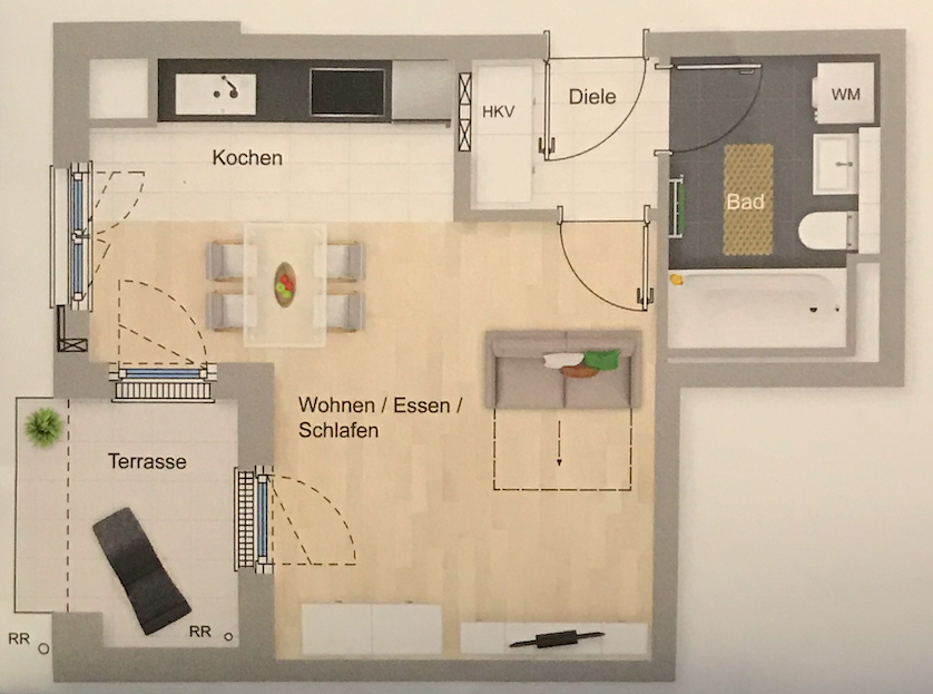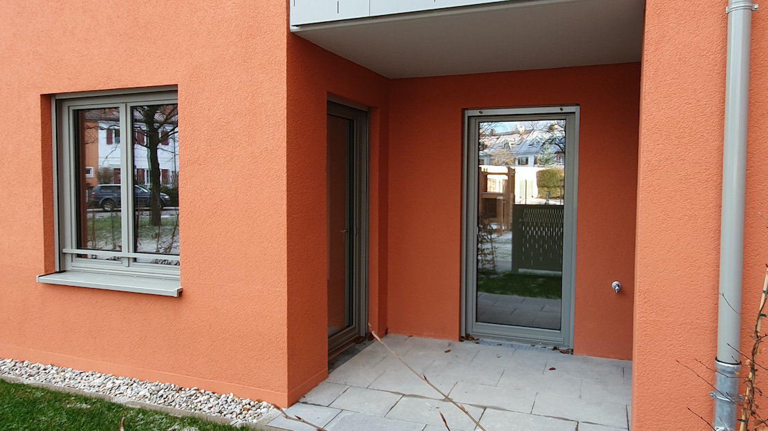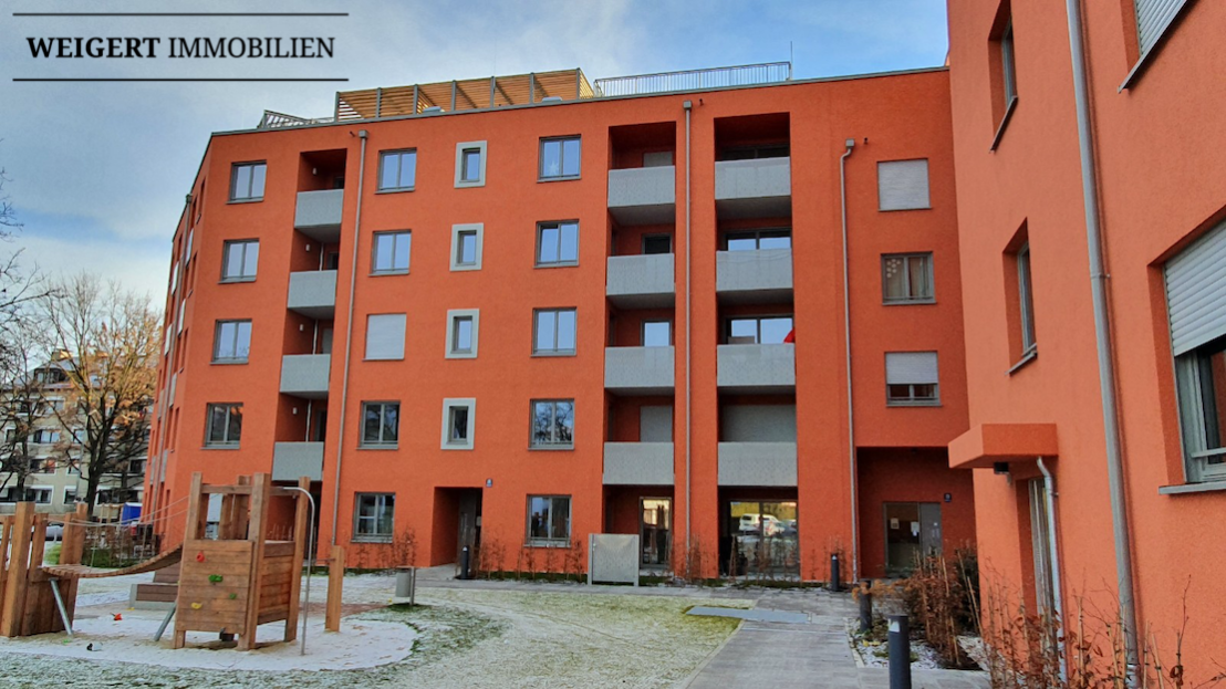 Die Wohnung befindet sich im Erdgeschoss eines gerade fertiggestellten Neubaus der Wohnanlage „Luisengrün“ in der Konrad-Celtis-Straße / Mainburger Strasse. Die helle Wohnung verfügt über einen funktionalen Grundriss und eine hochwertige Ausstattung, zu der Fußbodenheizung, Eichenholzparkett, weiße Türen, eine Einbauküche und ein komfortables Bad gehören. Über die Diele gelangen Sie in das Bad, sowie das Wohnzimmer – den Mittelpunkt der Wohnung. Von hier aus haben Sie Zugang zur Terrasse und einen kleinen Gartenanteil und zur offenen Küche. Die Terrasse mit circa 5 m2 wurde zur Hälfte bei der Wohnflächenberechnung berücksichtigt. Die Küche wird vermieterseitig gestellt und in den nächsten Tagen verbaut. Das Wannenbad (mit Waschmaschinen- und Trockner-Anschluss) ist in einer hellen Optik mit großflächigen Fließen gestaltet und hat einen zusätzlichen Handtuchheizkörper. Eine komfortable Elektro-, TV- und Telefonausstattung sowie eine Gegensprechanlage mit Kamera runden die hochwertige Ausstattung ab. Zur Wohnung gehören ein Tiefgaragenstellplatz (kein Duplex) und ein abschließbares Kellerabteil (knapp 5 m2) mit Licht und Stromanschluss. Zur gemeinschaftlichen Nutzung stehen allen Bewohnern Fahrradräume (mit eigenem Lift), ein Kinderwagenraum, der begrünte Innenhof mit Sitzgelegenheiten und Spielgeräten und – als besonderes Highlight – der Dachgarten zur Verfügung, in dem Sie laue Sommerabende oder das Silvesterfeuerwerk genießen können. Der Aufzug führt von der Tiefgarage bis in die Dachetage (stufenloser Zugang).