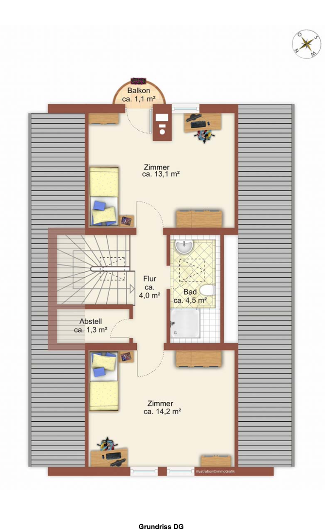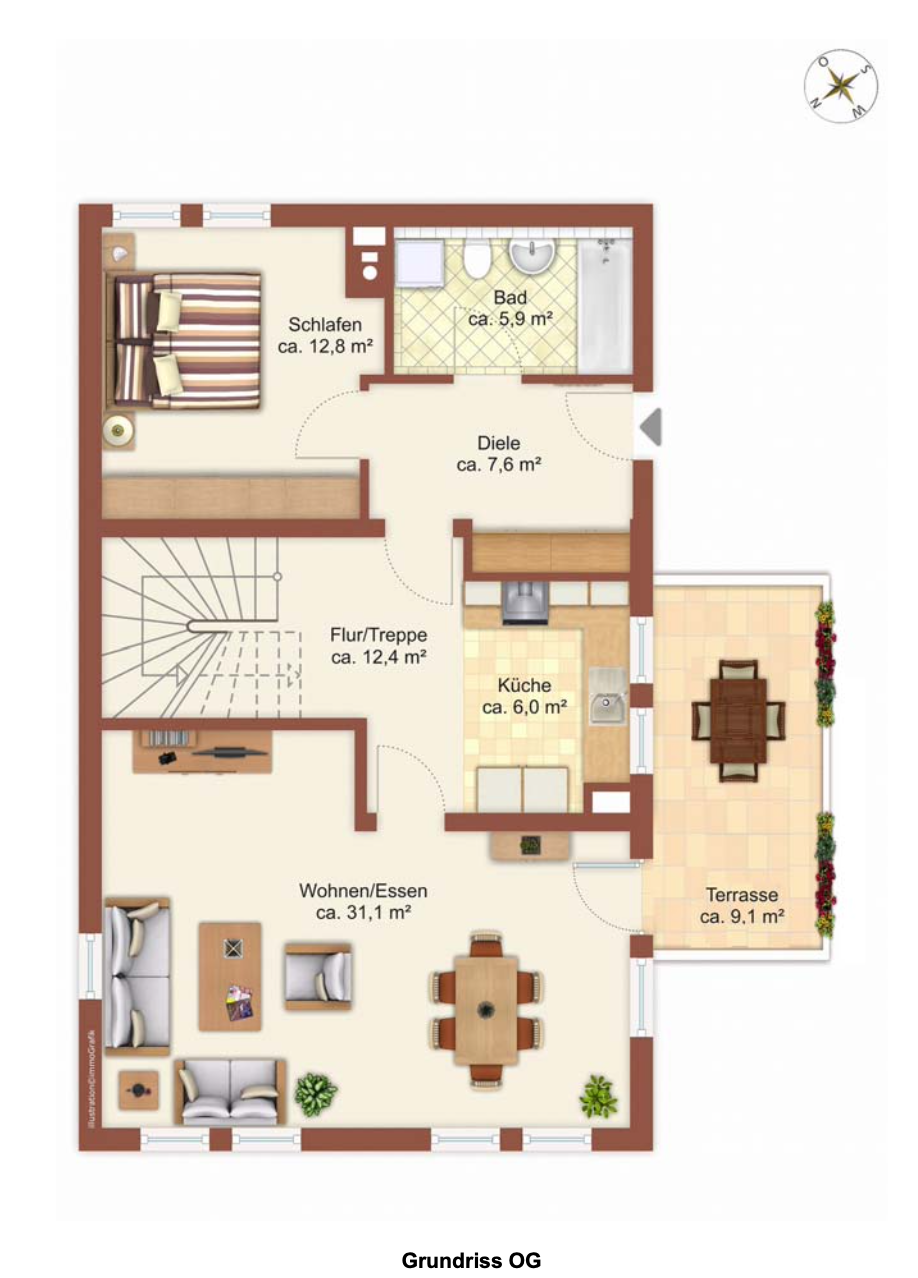 Sie betreten die Wohnung über die großzügige Diele, die ausreichend Platz für eine große Garderobe bietet. Hiervon gelangen Sie ins geschmackvolle Wannenbad mit Waschmaschinen- und Trockneranschluss und das Schlafzimmer, das über einen modernen Einbauschrank verfügt. Die Wohnung besteht weiterhin aus dem großzügigen Wohnzimmer mit hochwertig gespachtelter Wand und Zugang zur großzügigen Süd-West- Terrasse, einer offenen Küche hin zum Treppenaufgang, der Platz für einen kleinen Esstisch verfügt und über den Sie das Dachgeschoss erreichen. Hier befinden sich zwei fast gleich große Zimmer, die optimal als Kinderzimmer, Büro oder Gästezimmer genutzt werden können. Zudem befindet sich im Dachgeschoss ein Duschbad mit Tageslicht. Zur Wohnung gehören zusätzlich ein Kellerabteil und zwei Einzelstellplätze in der Tiefgarage (kein Duplex!)…