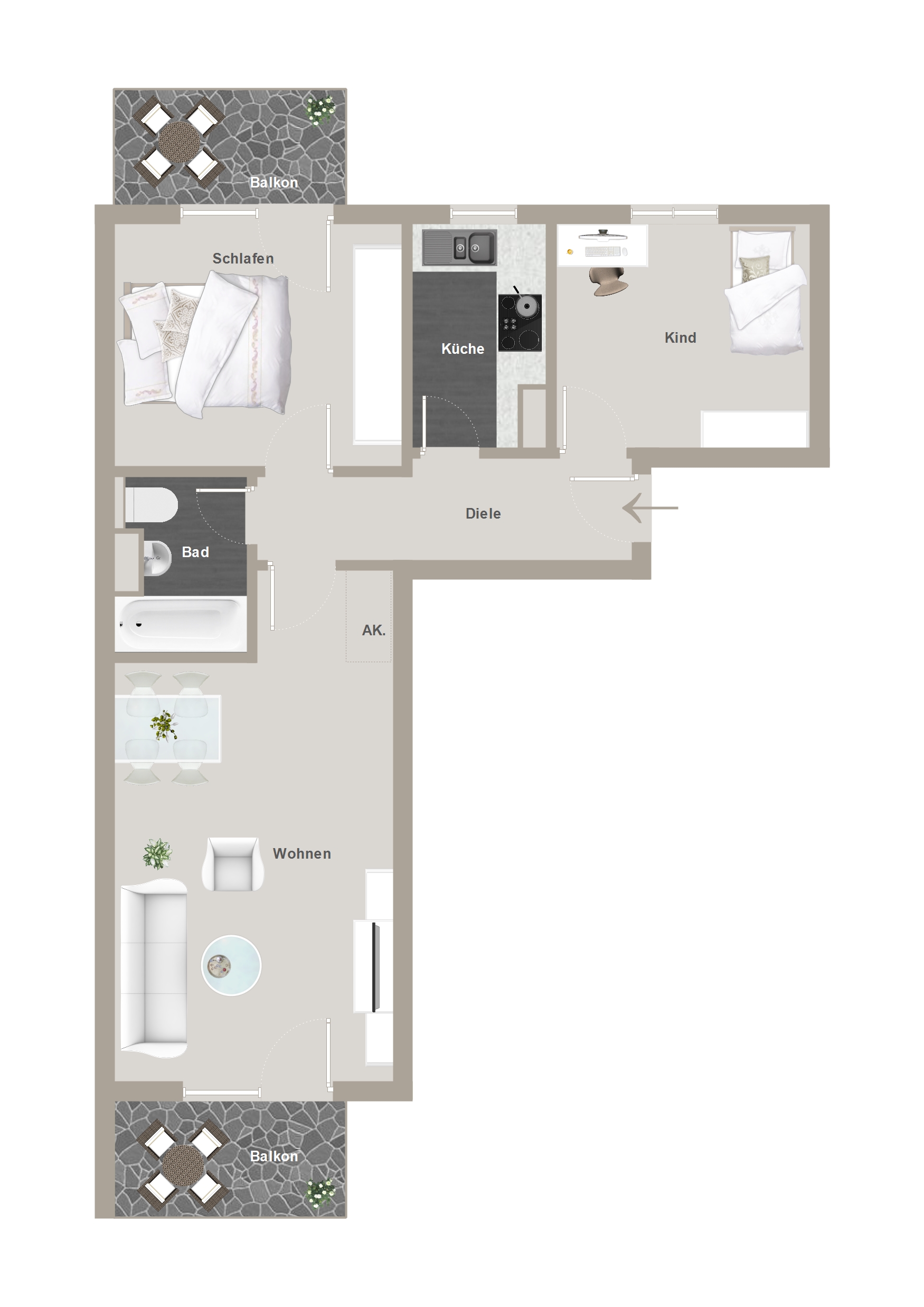 Unser neuestes Objekt ist eine helle und moderne 3-Zimmer-Wohnung mit 2 Balkonen in einer ruhigen Wohngegend in Dachau. Das Haus (Baujahr 1993) und die gesamte Wohnanlage vermitteln einen sehr gepflegten Eindruck. Vor Ihrem Einzug wurden in der Wohnung noch diverse Renovierungsmaßnahmen vorgenommen – Unter anderem wurde im Wohnzimmer und den Schlafzimmern ein Laminatboden verlegt, sämtliche Innentüren ausgetauscht, neu gemalert und die Toilette, das Waschbecken und die Armaturen im Bad erneuert. Hervorzuheben sind die wirklich ruhige Lage und die gute ausgebaute Infrastruktur in der näheren Umgebung. Der ansprechende Boden in Eiche Optik in den Wohnräumen, vermittelt ein behagliches Wohngefühl. Die Wohnung befindet sich im 1. Stock. Das innenliegende Bad verfügt über eine Badewanne, einen Spiegel, ein Waschbecken und eine Toilette. Alle Räume, d.h. das Bad, die Küche, die beiden Schlafzimmer und der Wohn-/Essbereich sind über den Flur erreichbar. Die beiden Balkone betreten Sie über das Wohnzimmer bzw. eins der Schlafzimmer. Das Kellerabteil (Licht und Stromanschluss) bietet mit ungefähr 3,5 Quadratmetern Nutzfläche wertvollen Stauraum- Nützlich sind hier die bereits vorhandenen Regale. Im Keller befindet sich der Wasch- und Trockenraum (ein Waschmaschinenanschluss ist in der Wohnung nicht vorhanden). Ihre Fahrräder können im Fahrradraum im Kellergeschoss sicher und trocken untergebracht werden. Der monatliche Mietpreis für den Stellplatz in der Tiefgarage (Duplex) beträgt 50,– Euro…