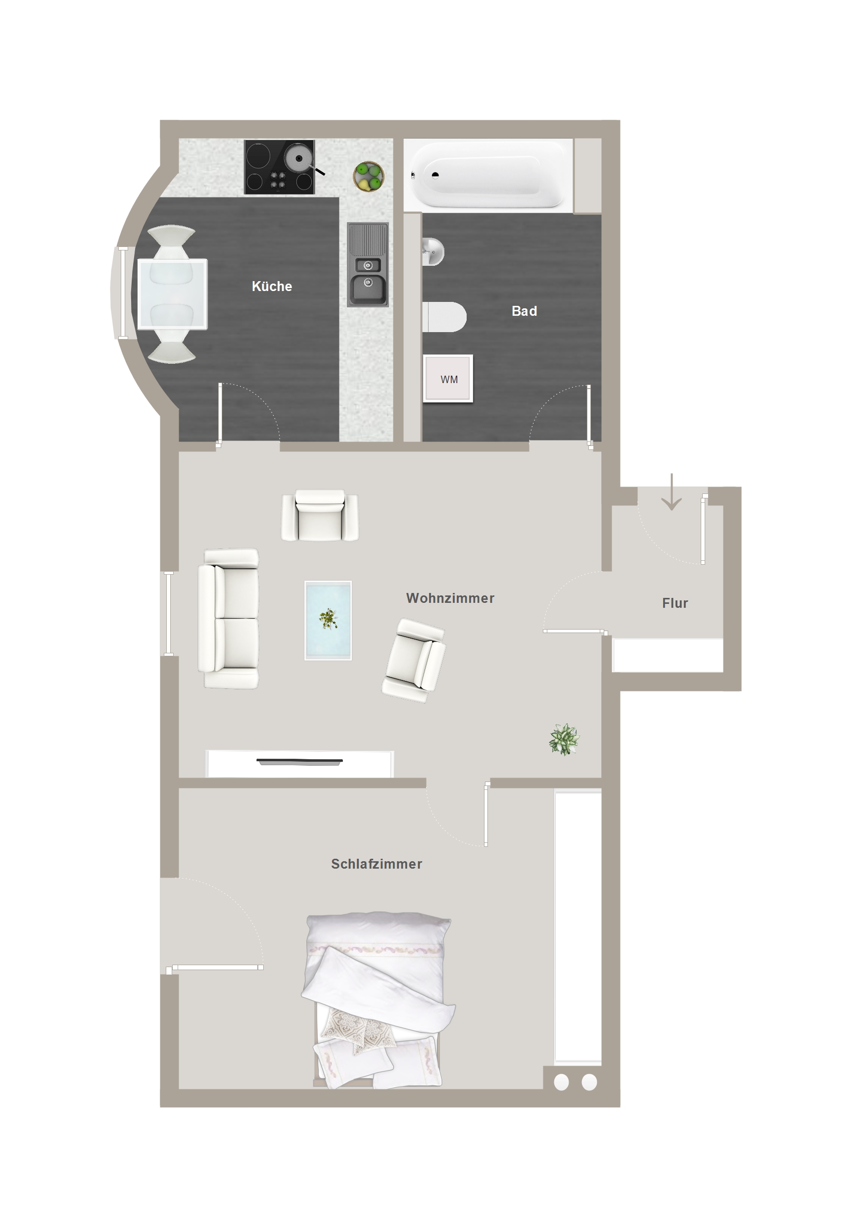 Die angebotene 2-Zimmer-Wohnung mit circa 43 Quadratmetern Wohnfläche ist langjährig vermietet. Die Wohnung selbst und das Haus vermitteln einen sehr gepflegten Eindruck. Hervorzuheben sind hier die ruhige und doch zentrale Lage, liebevoll angelegte und gepflegte Gründflächen und ein ansprechender Grundriss. Die Wohnung befindet sich im 1. Obergeschoss, ein Aufzug ist nicht vorhanden. Die Küche ist Eigentum der Mieter. Das innenliegende Bad verfügt über eine Badewanne, ein Waschbecken, eine Toilette und einen Waschmaschinenanschluss. Alle Räume, d.h. das Bad, die Küche und das Schlafzimmer sind über den Wohn-/Essbereich erreichbar. Das Wohnzimmer betreten Sie über den Flur, der bei einer Fläche von knapp 2 Quadratmetern noch ausreichend Platz für eine Garderobe bietet. Im Kellerabteil mit knapp 5 Quadratmeter Nutzfläche haben Sie darüber hinaus genug Stauraum, um Ihre persönlichen Sachen zu lagern. Für die Allgemeinheit wurde eine praktische Fahrradgarage vor den Häusern aufgestellt.