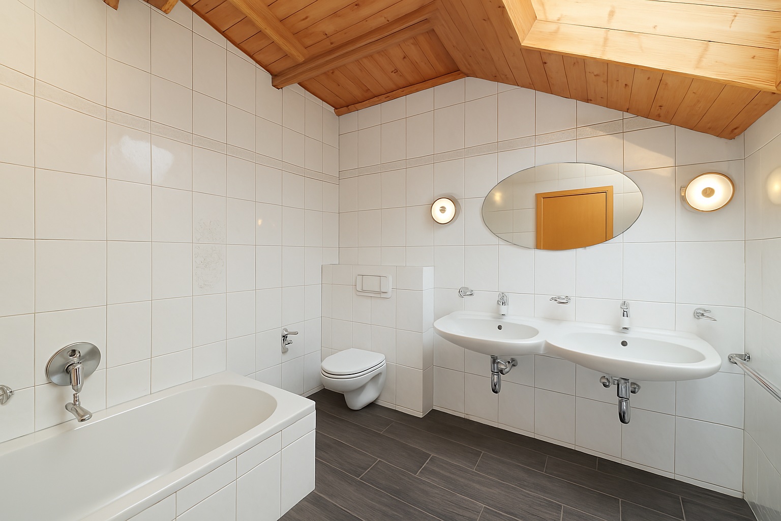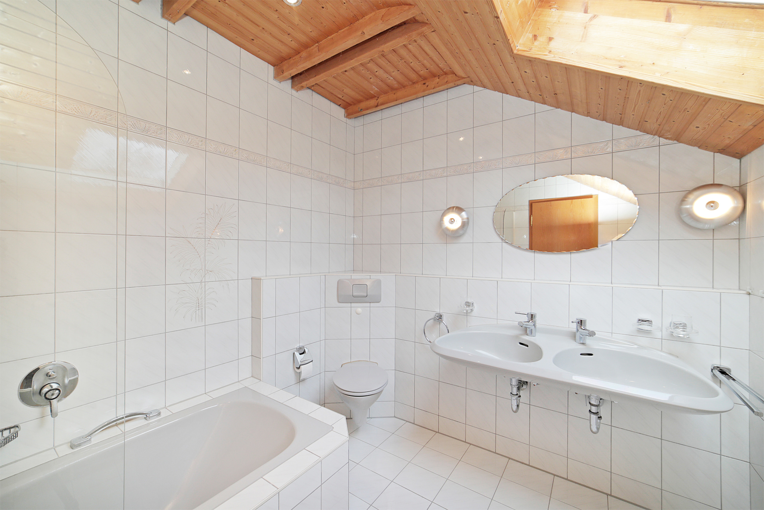 - Helles Tageslichtbad im Obergeschoss mit Badewanne, Spiegel, Doppelwaschbecken und WC