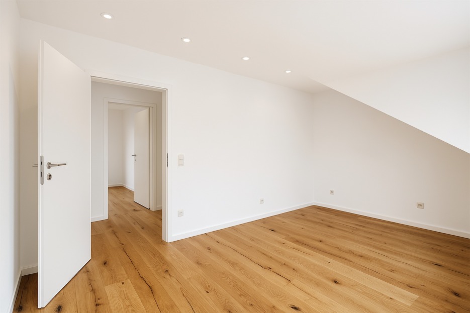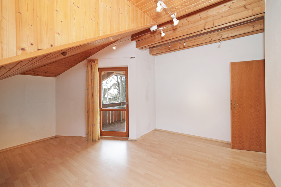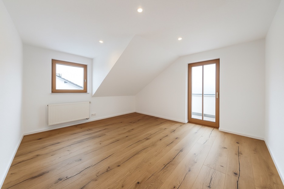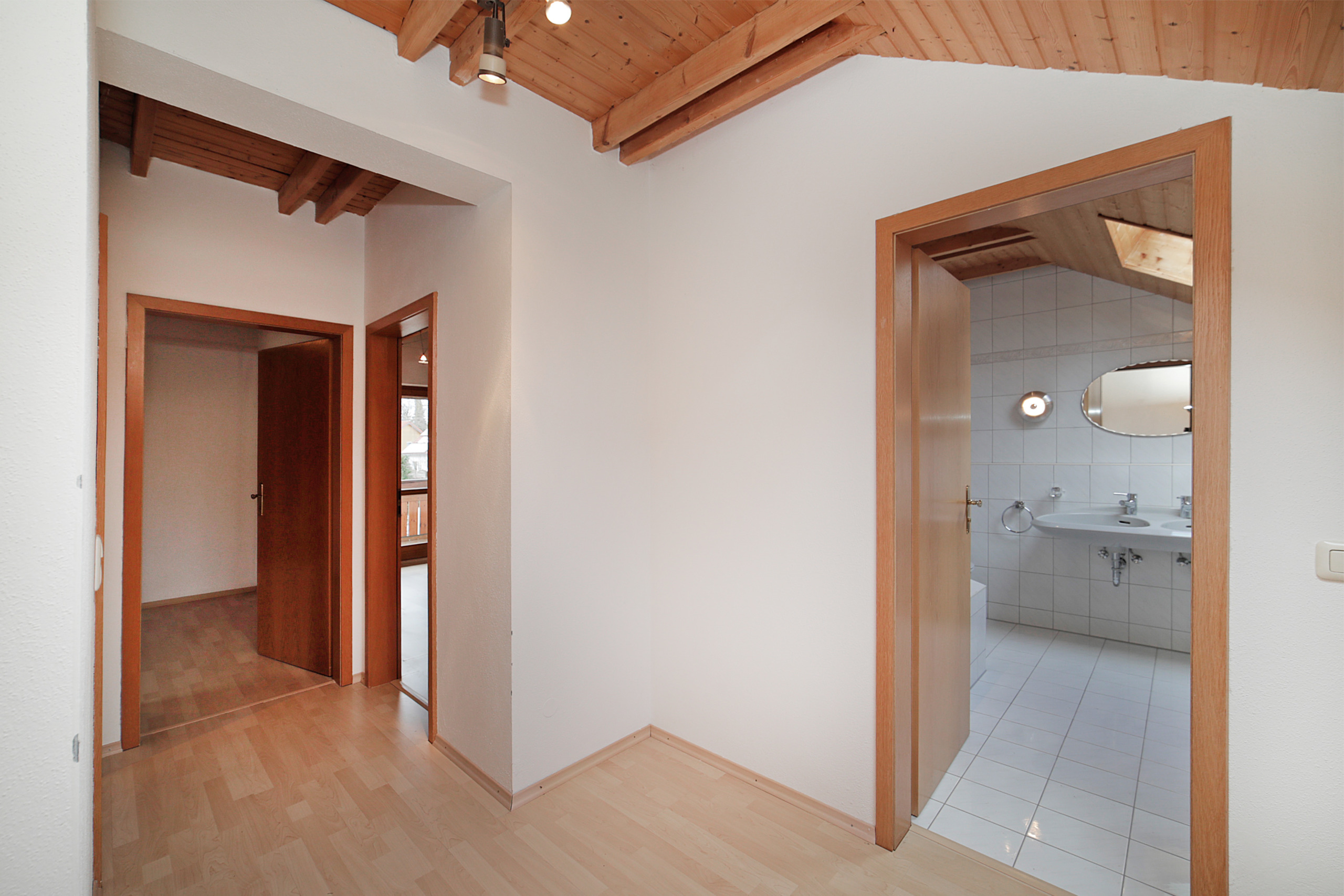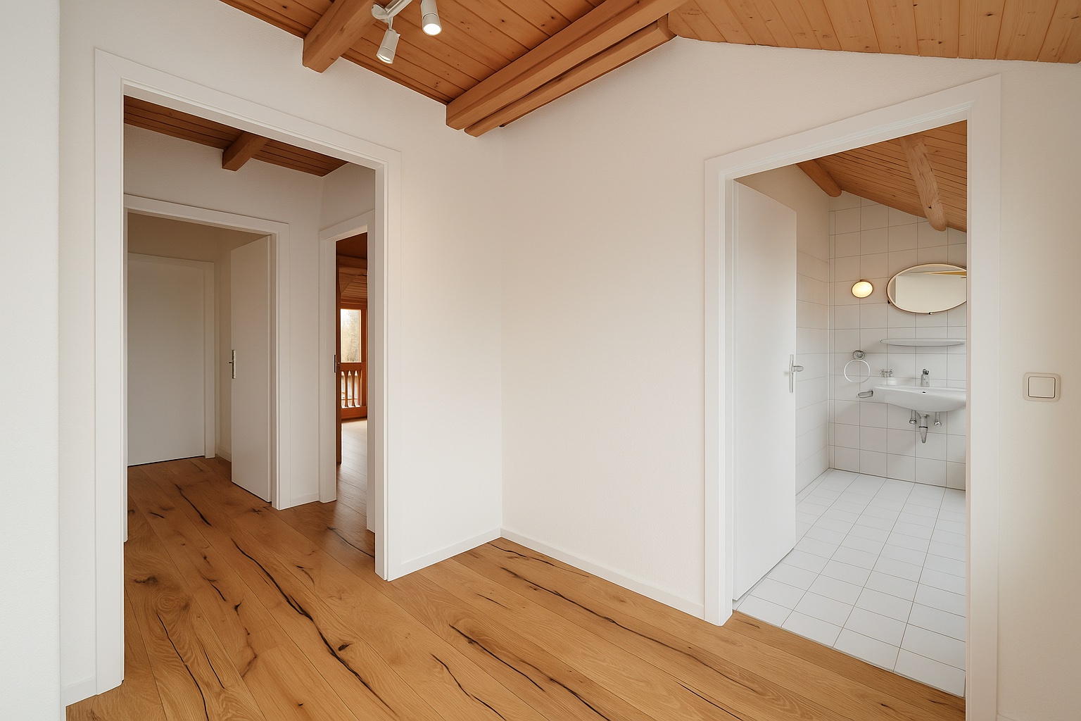 Im Obergeschoss befinden sich drei Schlafzimmer – über zwei der Schlafzimmer haben Sie Zugang zum Balkon – und das ansprechende Bad. Das große Schlafzimmer verfügt über einen Doppelboden mit Platz für ein Bett und würde sich ideal als Kinderzimmer anbieten. Das Tageslichtbad ist mit einer Badewanne mit Glasabtrennung, einem Doppelwaschbecken, einem Spiegel und einem WC ausgestattet und lässt keine Wünsche offen.