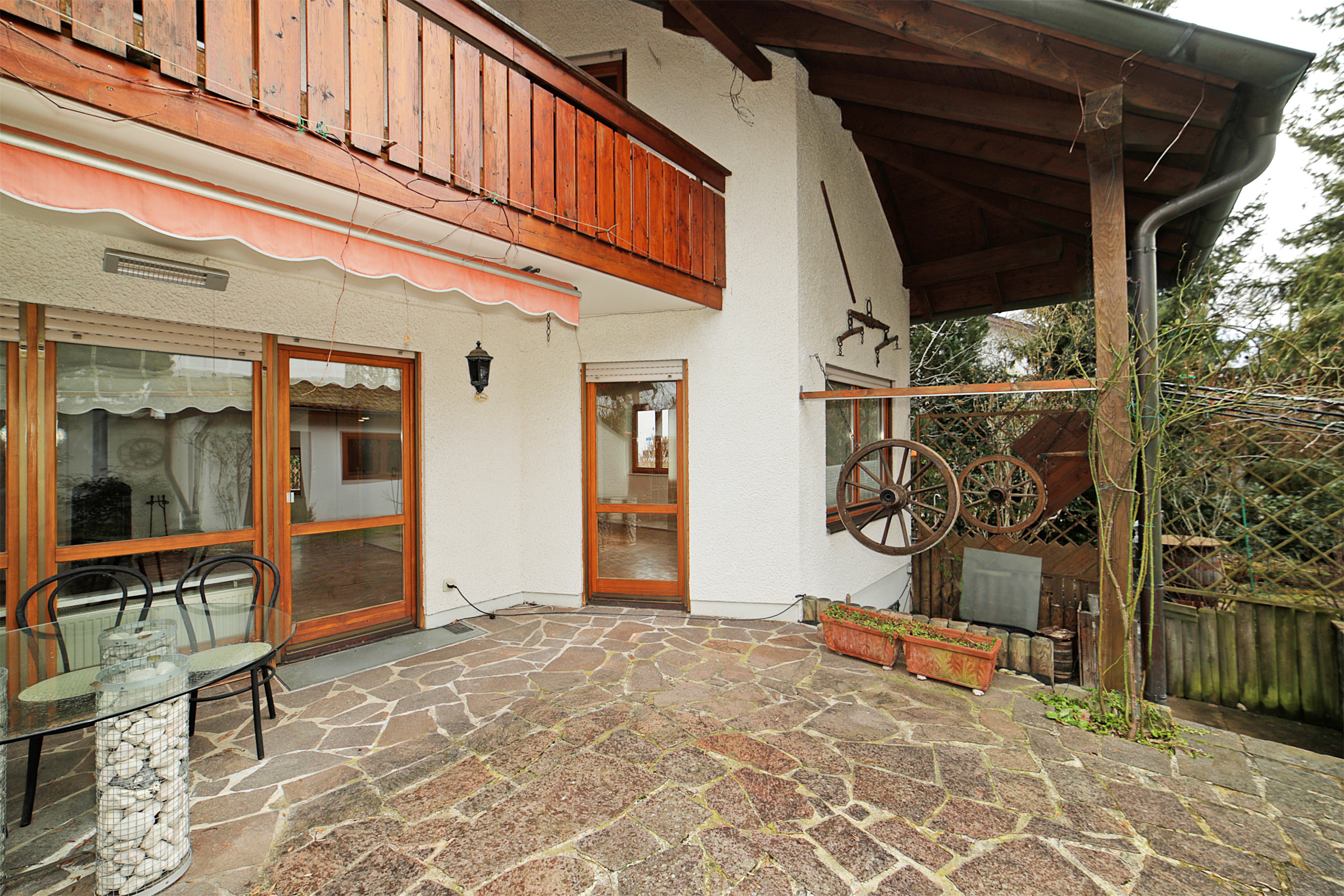 - Großzügige (circa 36 Quadratmeter Grundfläche), geschwungene Terrasse mit Polygonalplatten (Naturstein) & Markise mit Ausrichtung nach Süden