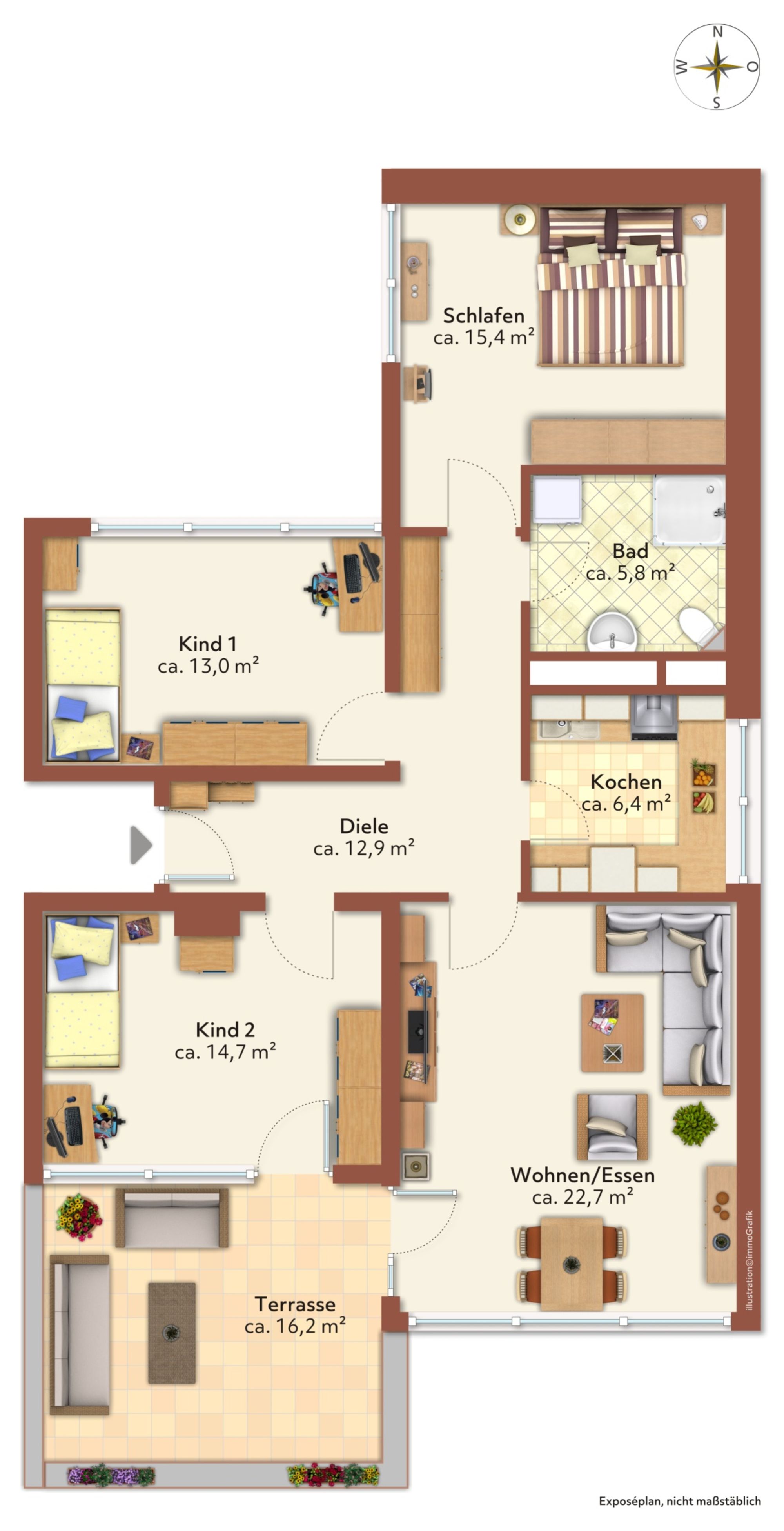 Das absolute Highlight der Wohnung ist sicherlich die über 16 Quadratmeter große, nach Süden ausgerichtete Dachterrasse mit Alpenblick, die Sie über das Wohnzimmer als auch ein Schlafzimmer erreichen.