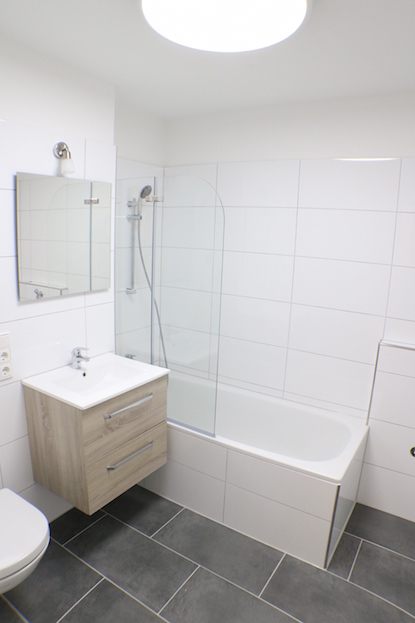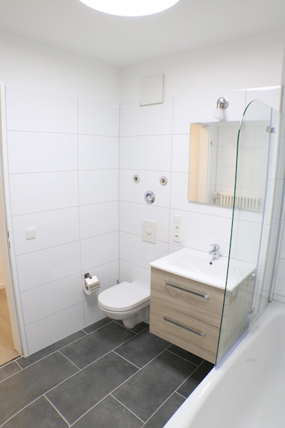 - Bad mit Badewanne, Glas-Duschabtrennung, WC (Villeroy & Boch), Waschbecken mit Unterschrank, Spiegel, Armaturen von Grohe, Waschmaschinenanschluss, dimmbare LED-Leuchte