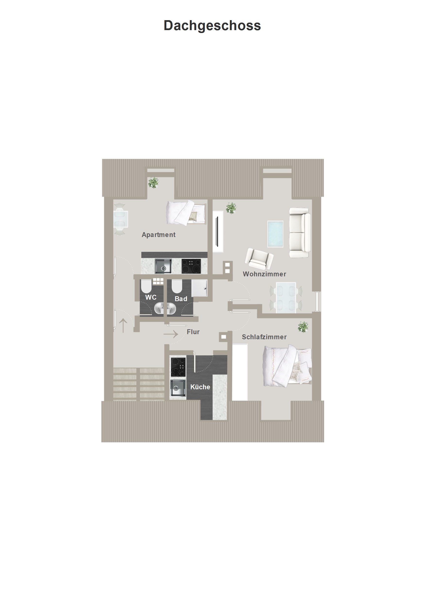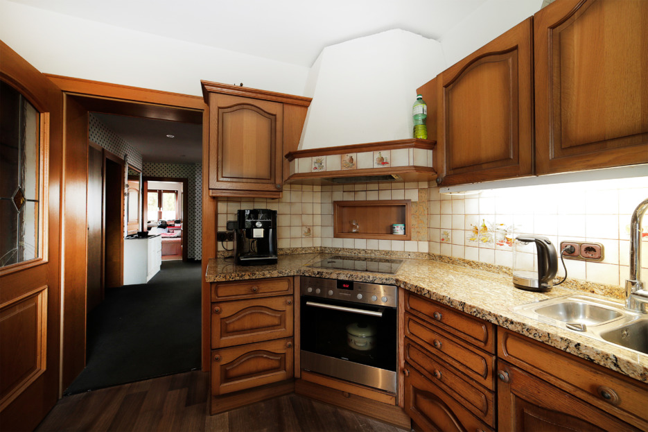 - Küchenausstattung im Dachgeschoss und Erdgeschoss – Die Küche im Obergeschoss verfügt über keine Küchenausstattung