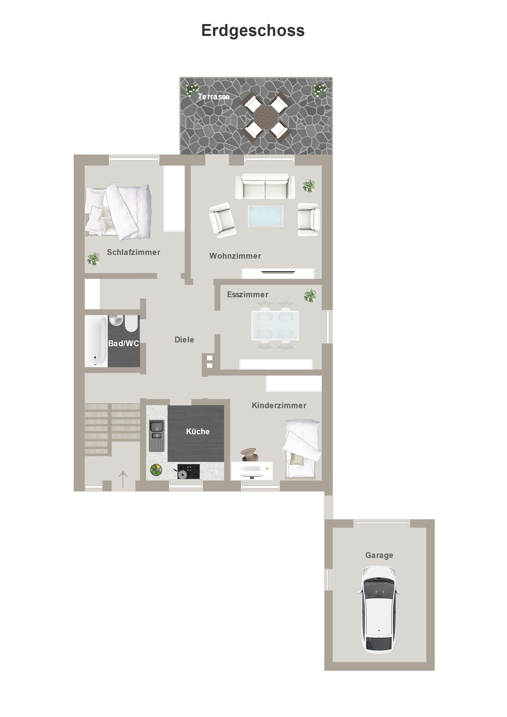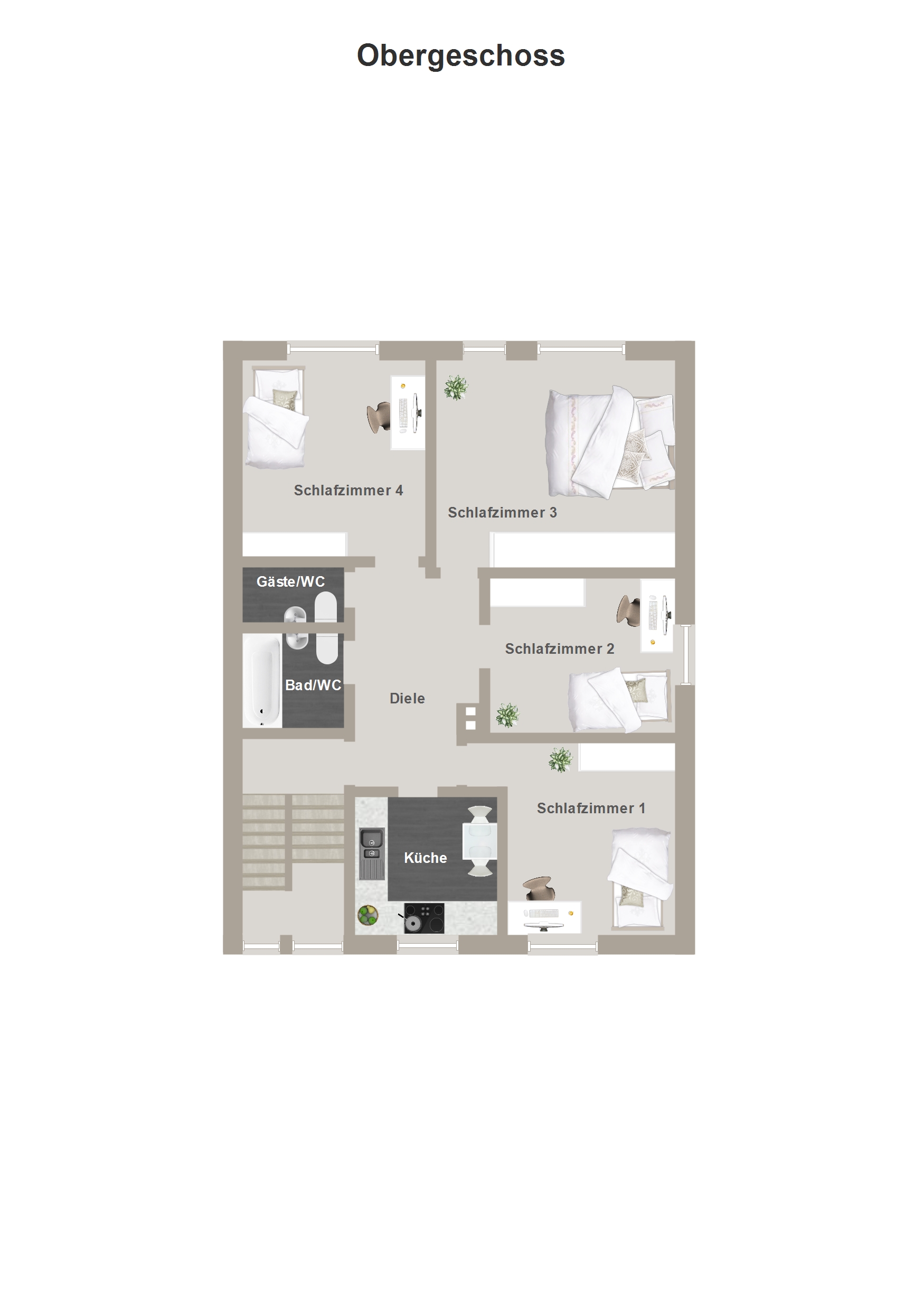 - Innenliegende Bäder mit Dusche oder Badewanne; zusätzliches Gäste-WC im Obergeschoss statt Abstellkammer wie im Erdgeschoss