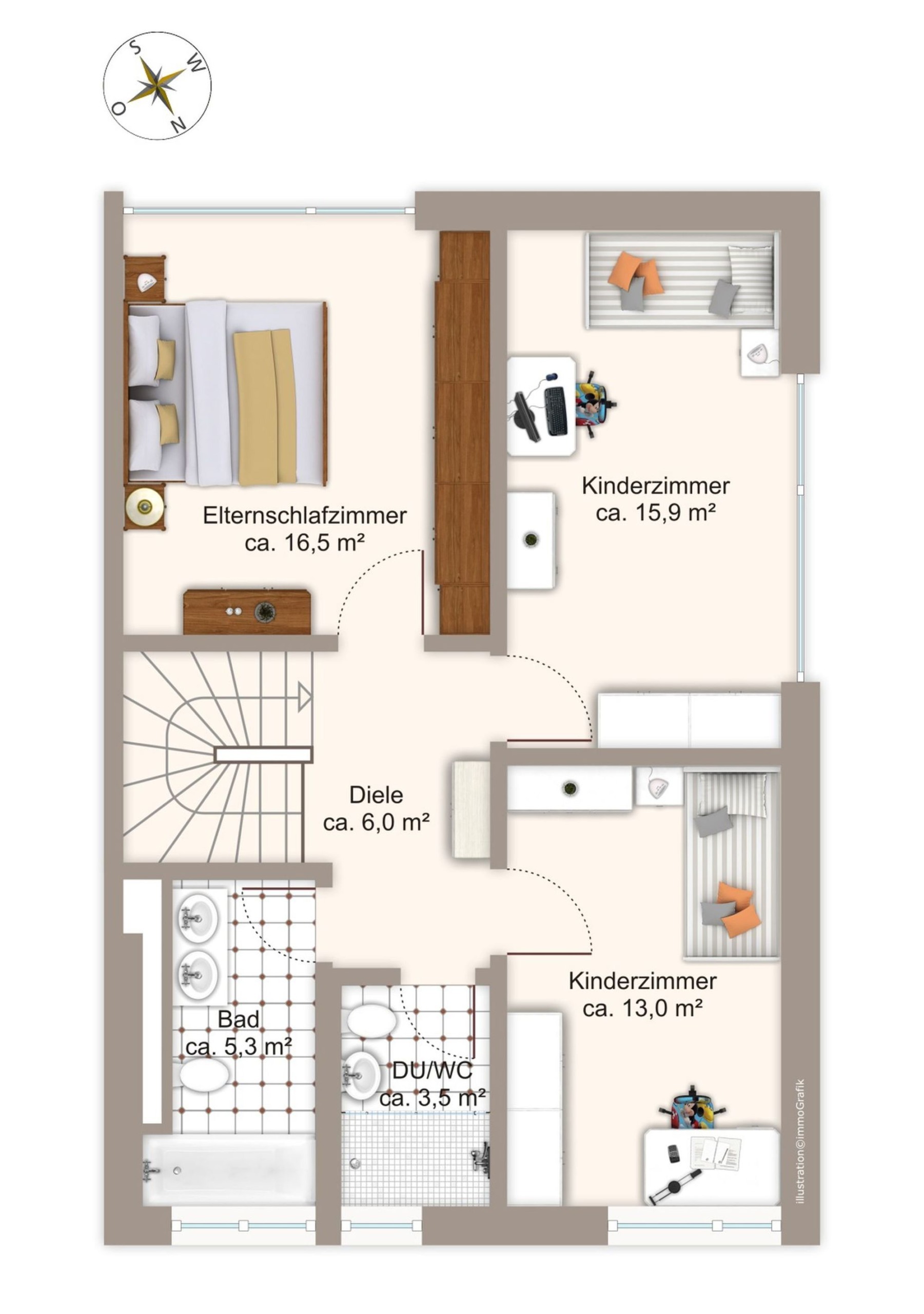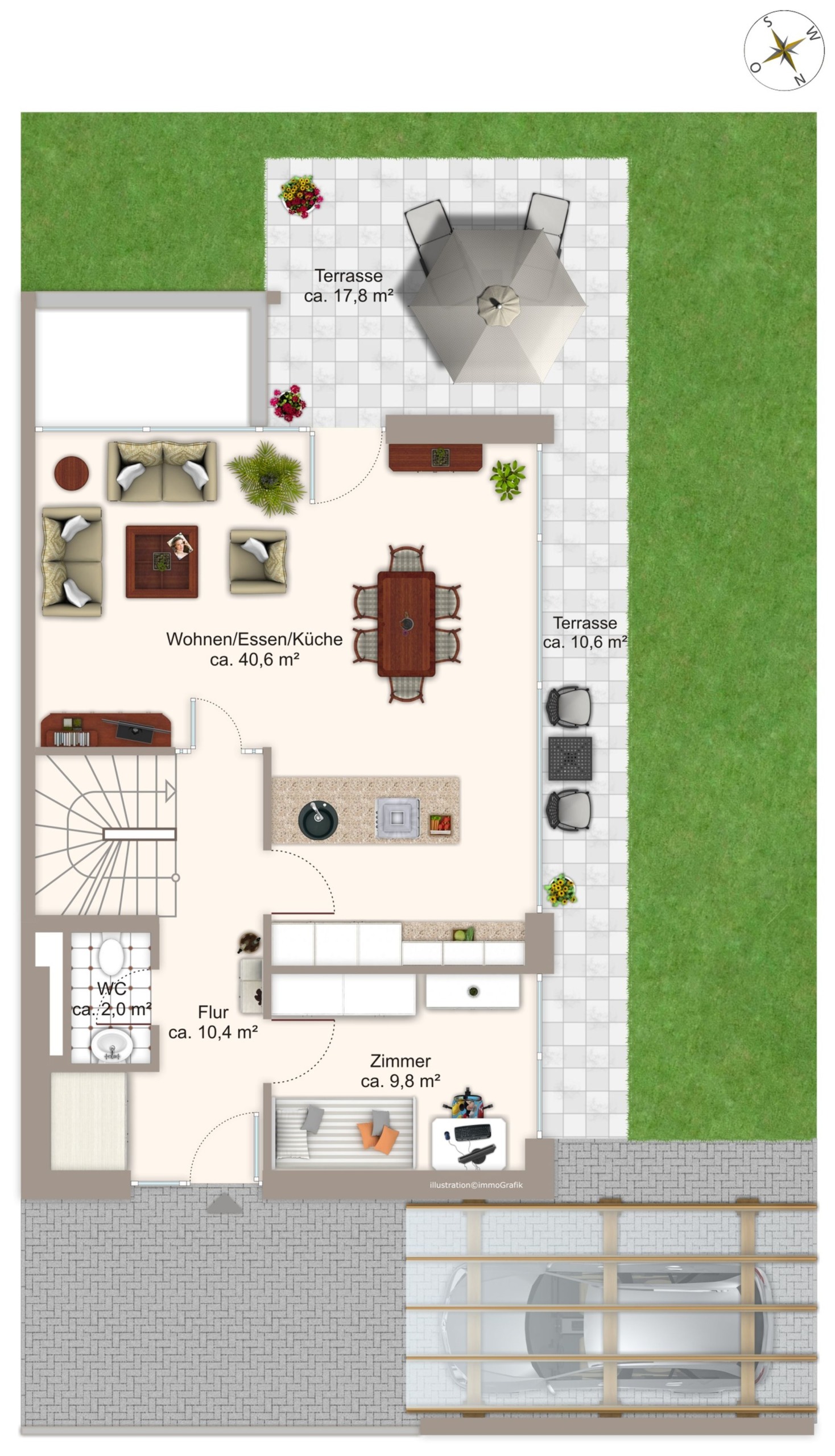 Die elektrisch steuerbaren Textilscreens in den Wohn- und Schlafräumen ermöglichen eine flexible Lichtregulierung und sorgen für eine angenehme Atmosphäre. Im Erdgeschoss erwartet Sie ein offener Wohn- und Essbereich, der ideal für gesellige Abende mit Familie und Freunden ist. Zudem stehen Ihnen ein Büro oder Arbeitszimmer, eine einladende Diele sowie ein Gäste-WC mit Fenster zur Verfügung. Die Diele und das Treppenhaus sind geschickt vom Wohnbereich abgetrennt, sodass Sie abends Ihre Privatsphäre genießen können, während Ihre Kinder Freunde empfangen.