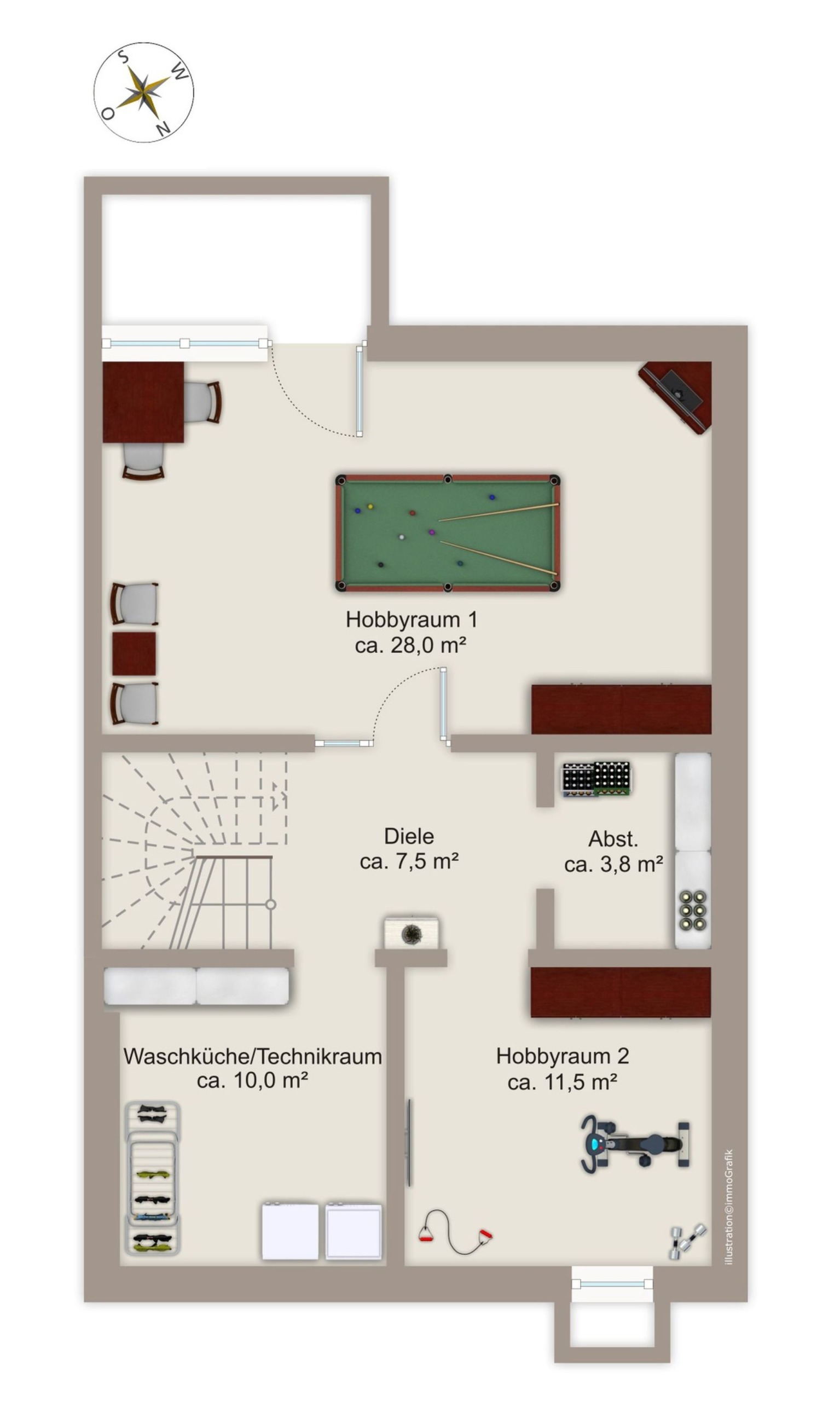 Das Kellergeschoss bietet Ihnen zwei großzügige, wohnraummäßig ausgebaute Hobbyräume, die durch die Fußbodenheizung und große Fenster optimal belichtet sind. Zusätzlich stehen Ihnen ein Abstellraum sowie ein Heizungs- und Waschraum zur Verfügung…