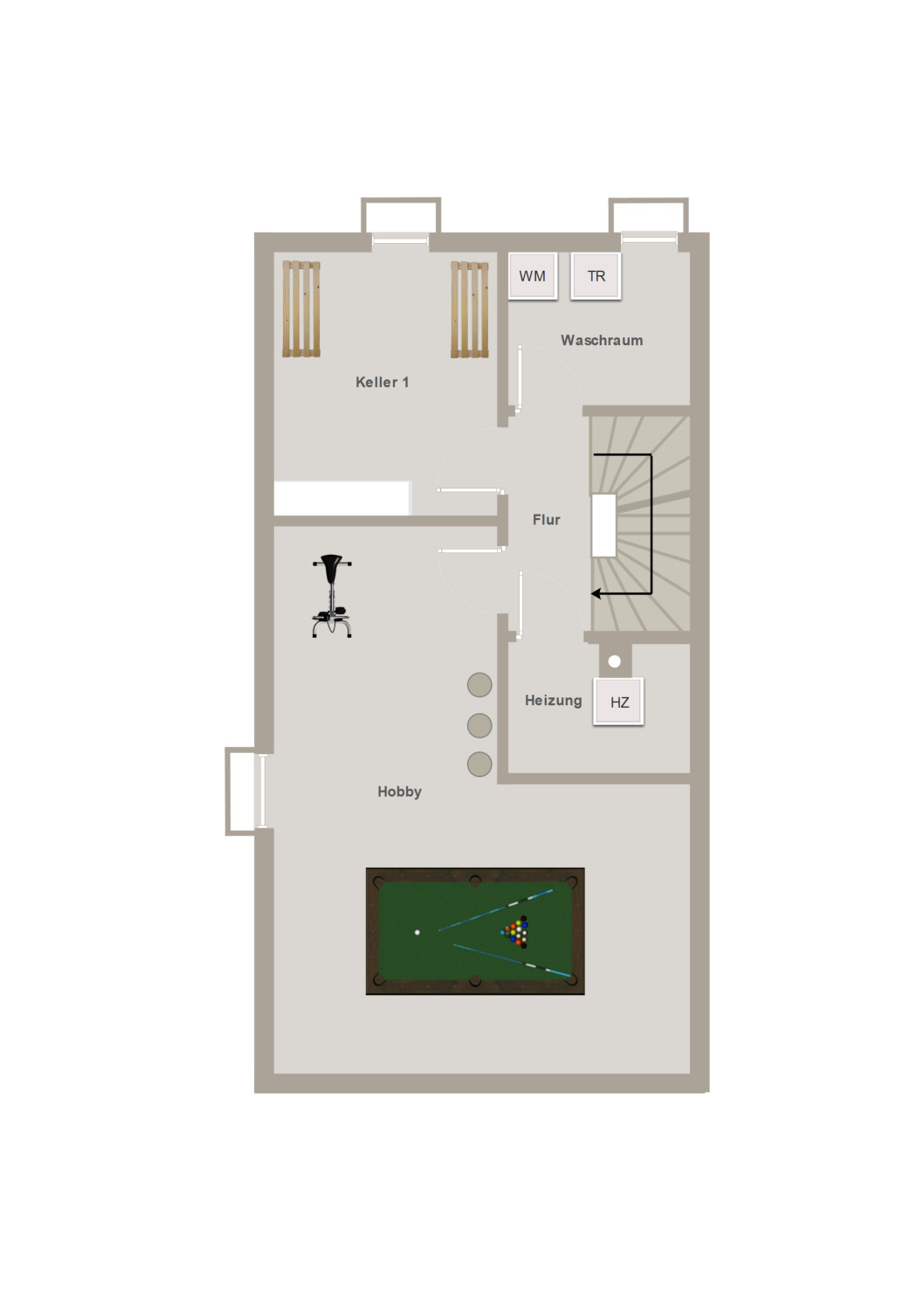 Im Untergeschoss eröffnet sich ein weiterer Wohnbereich mit Tageslicht und Fußbodenheizung: Der 26 m² große Hobbyraum kann vielseitig genutzt werden. Die hochwertige Sauna (9 kW, für bis zu 4 Personen) sorgt für pure Entspannung. Weitere Räume dienen als Werkstatt, Vorrats- sowie Wasch- und Heizraum. Die Kellerfenster sind mit hochwassersicheren Fenstern der Marke Rank ausgestattet – durchdacht bis ins Detail.