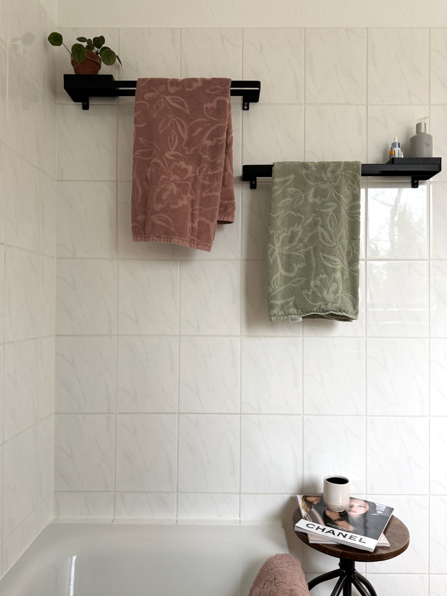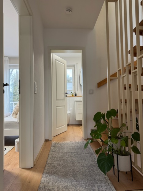 Im Obergeschoss befinden sich zwei Schlafzimmer – jedes mit eigenem Balkon und Holzfliesenbelag, die dem Außenbereich ein warmes, natürliches Flair verleihen. Das Tageslichtbad mit Badewanne ist hell und sehr ansprechend, die Böden sind mit hochwertigem Holzlaminat (Optik Eiche) versehen. Weiße Landhaustüren mit schwarzen Drückern unterstreichen das stimmige, elegante Gesamtbild.