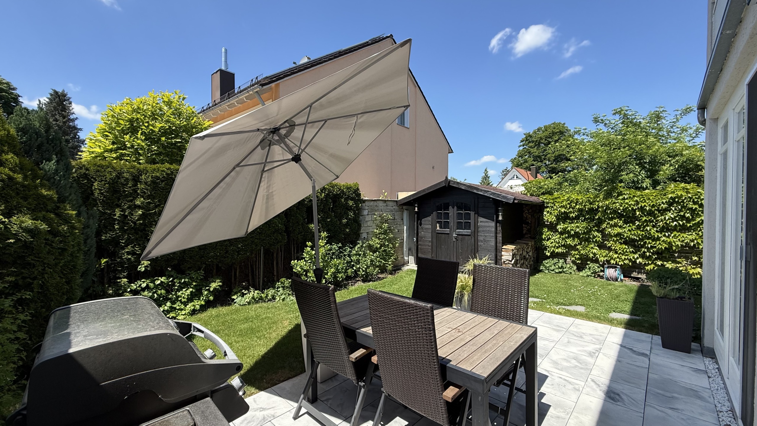 Das gepflegte Grundstück bietet nicht nur Platz zum Spielen und Entspannen, sondern auch praktische Extras: ein großes Gartenhaus, eine Einzelgarage sowie zwei Außenstellplätze. Teilweise sind Insektenschutzgitter an Türen angebracht – ideal für ungestörte Sommerabende bei geöffneten Fenstern.