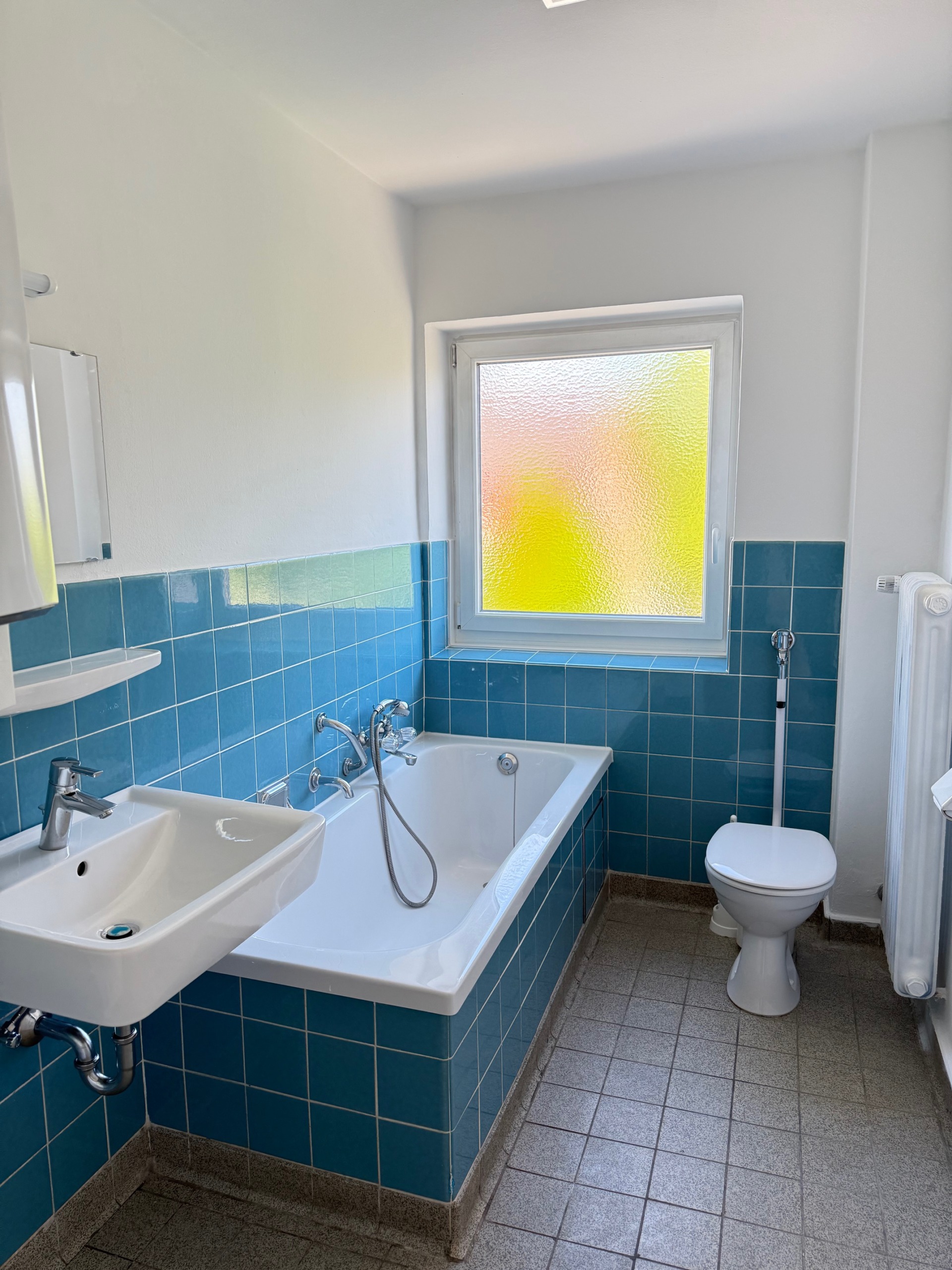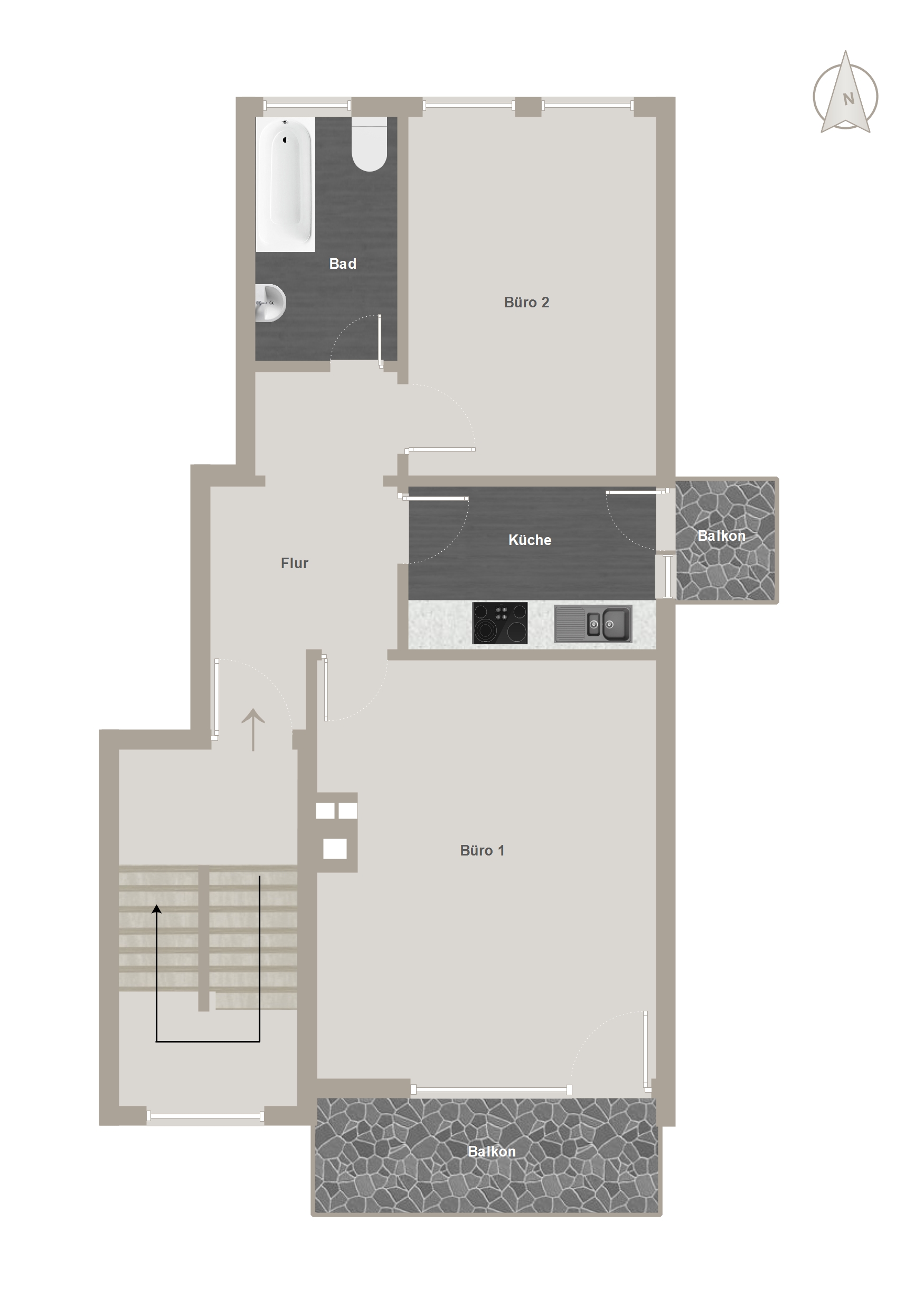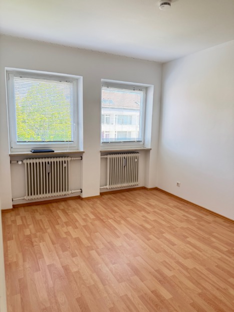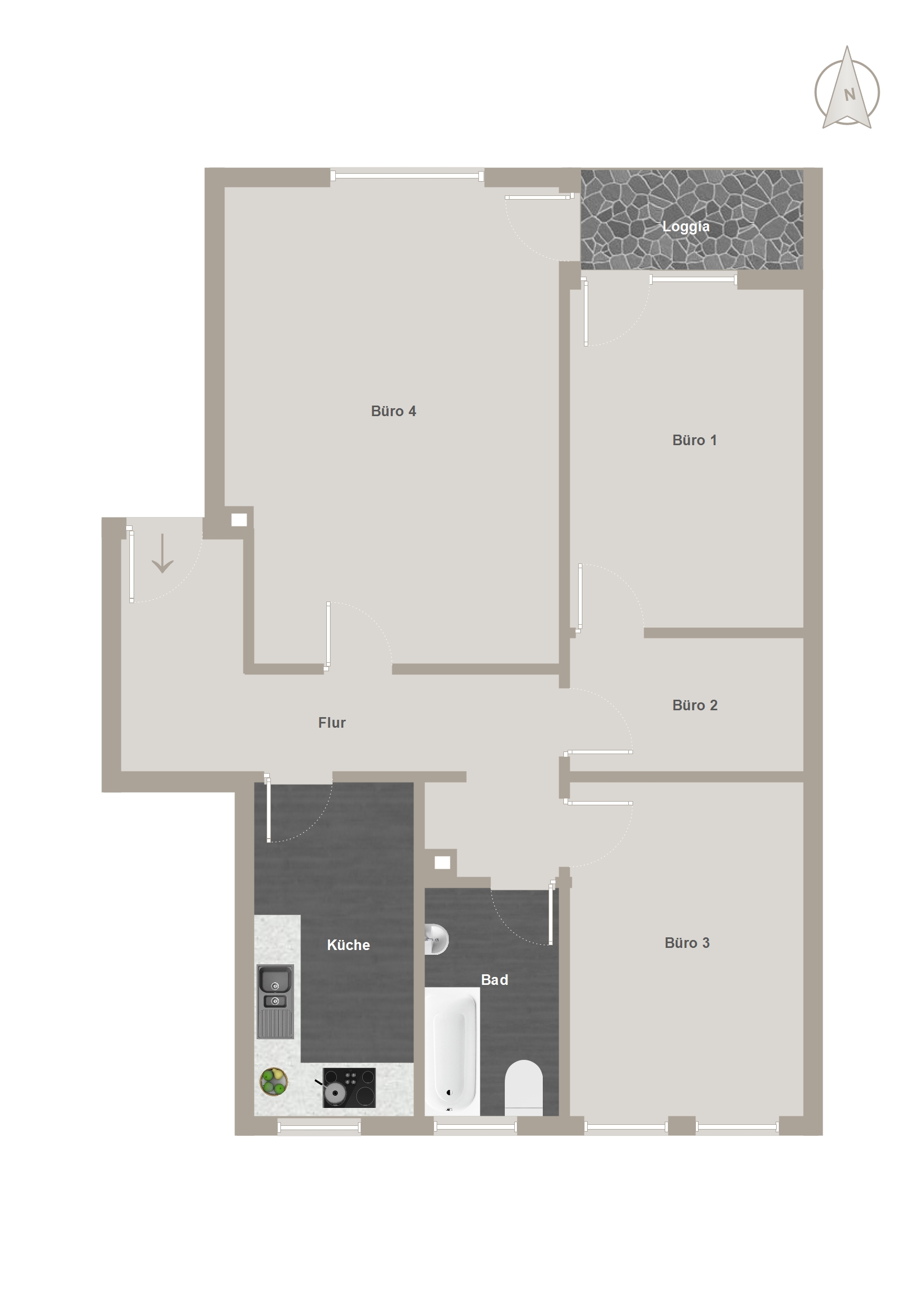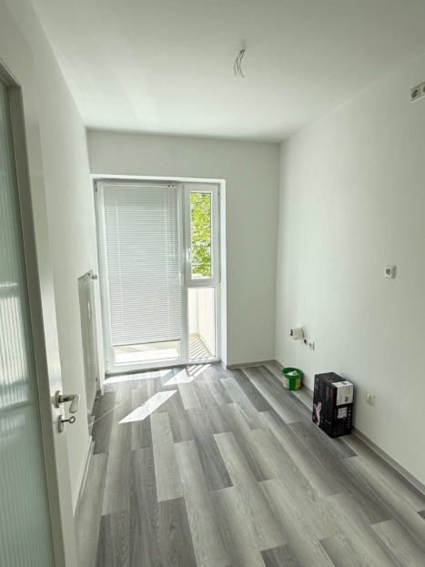 Die Einheit im 1. Obergeschoss bietet vier gut geschnittene Büroräume, von denen jeder direkt vom zentralen Flur zugänglich ist – eine Aufteilung, die sowohl konzentriertes Arbeiten als auch Teamstrukturen ermöglicht. Besonders großzügig zeigt sich Büro 4, das auch für repräsentative Zwecke oder als Besprechungszimmer geeignet ist. Büro 1 bietet direkten Zugang zur Loggia, die – ebenfalls nach Süden ausgerichtet und neu beschichtet – ein angenehmes Außenklima schafft. Eine praktische Küche mit Fenster und angrenzendem Flur bietet Platz für eine Teeküche (ohne Ausstattung). Auch hier ist das Bad mit Fenster und Wanne ausgestattet. Die Einheit ist ebenfalls mit Laminat- bzw. Linoleumböden ausgestattet, Fenster und Türen entsprechen der Ausführung der unteren Einheit.